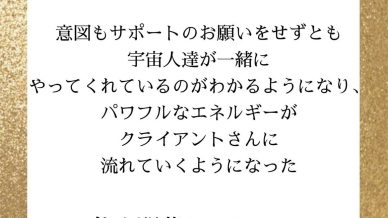 能力開花セッション受けられたМ様アルクトゥルス宇宙人と強固な繋がりでヒーリング力がさらに上がりました。能力開花を受けられてまだ1月程ですが意図もサポートのお願いをせずとも宇宙人達が一緒にやってくれてい...